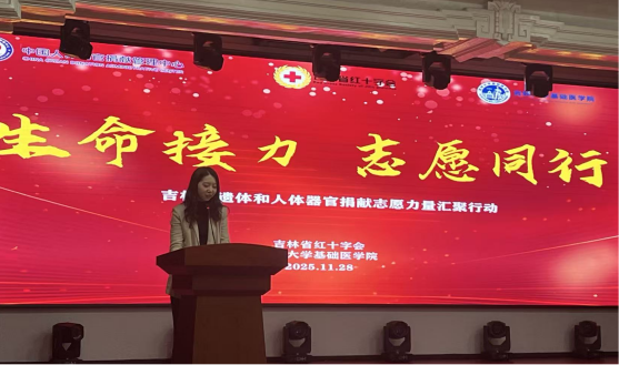 团委书记孙佳钰代表学院,向莅临现场的吉林省红十字会捐献服务中心主任刘艳丽、学院人体解剖学系实验室主任赵航等领导嘉宾致以热烈欢迎,向踊跃参与的志愿者同学们们表达诚挚谢意。随后,刘艳丽主任发表致辞,详细阐述了遗体与人体器官捐献的公益价值,介绍了相关政策支持与保障体系。她表示,吉林省红十字会将续深耕公益领域,以专业服务为遗体和人体器官捐献事业保驾护航,让大爱之举惠及更多家庭。